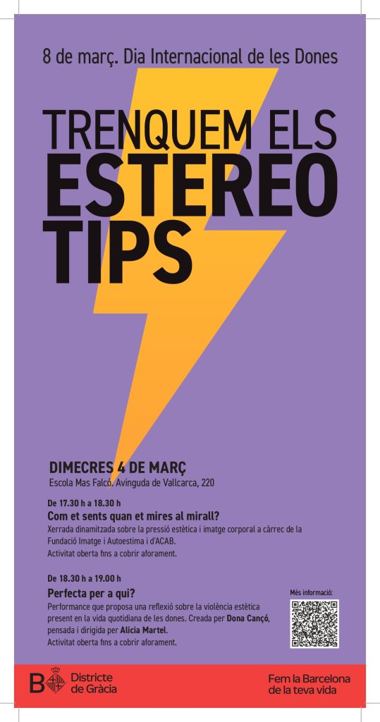 Amb motiu del Dia Internacional de les Dones, el Districte de Gràcia ha organitzat una jornada especial el pròxim dimecres 4 de març a l’Escola Mas Falcó. Sota el lema “Trenquem els estereotips”, la programació se centrarà a analitzar la pressió estètica i el seu impacte en les dones