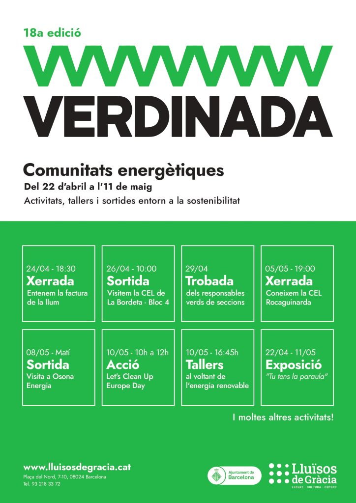 Del 22 d’abril a l’11 de maig tindrà lloc la 18a edició de la Verdinada, el projecte de sostenibilitat dels Lluïsos per excel·lència. Enguany, amb motiu de la Comunitat Energètica que estem tirant endavant des dels Lluïsos, aquesta serà la temàtica que ocuparà la major part de les activitats.