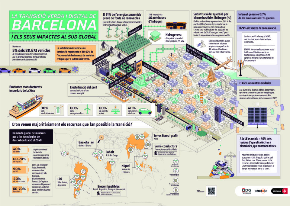El pròxim dijous 12 de març a les 19 h tindrà lloc una xerrada on Clàudia Custodio, membre de l’Observatori del deute en la globalització, ens parlarà sobre els Impactes de la transició verda i digital a Barcelona.